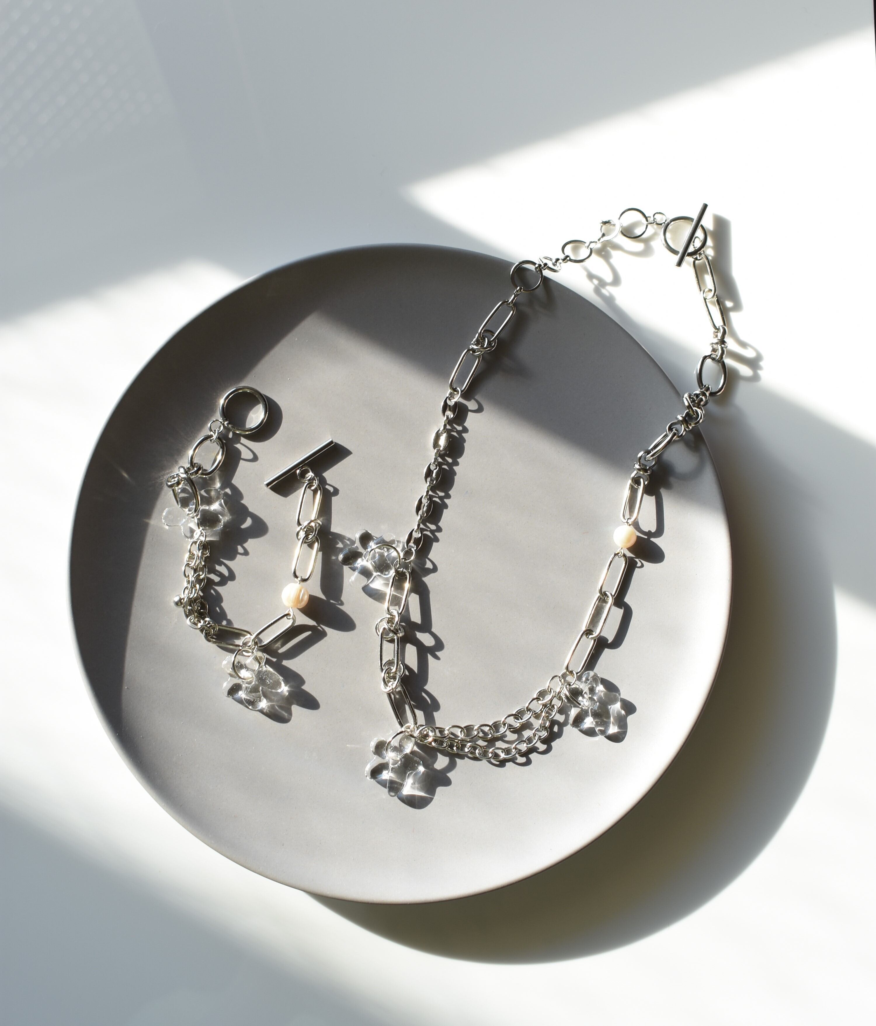 お花のガラスチャームととチェーン、淡水パールを組み合わたブレスレットです。