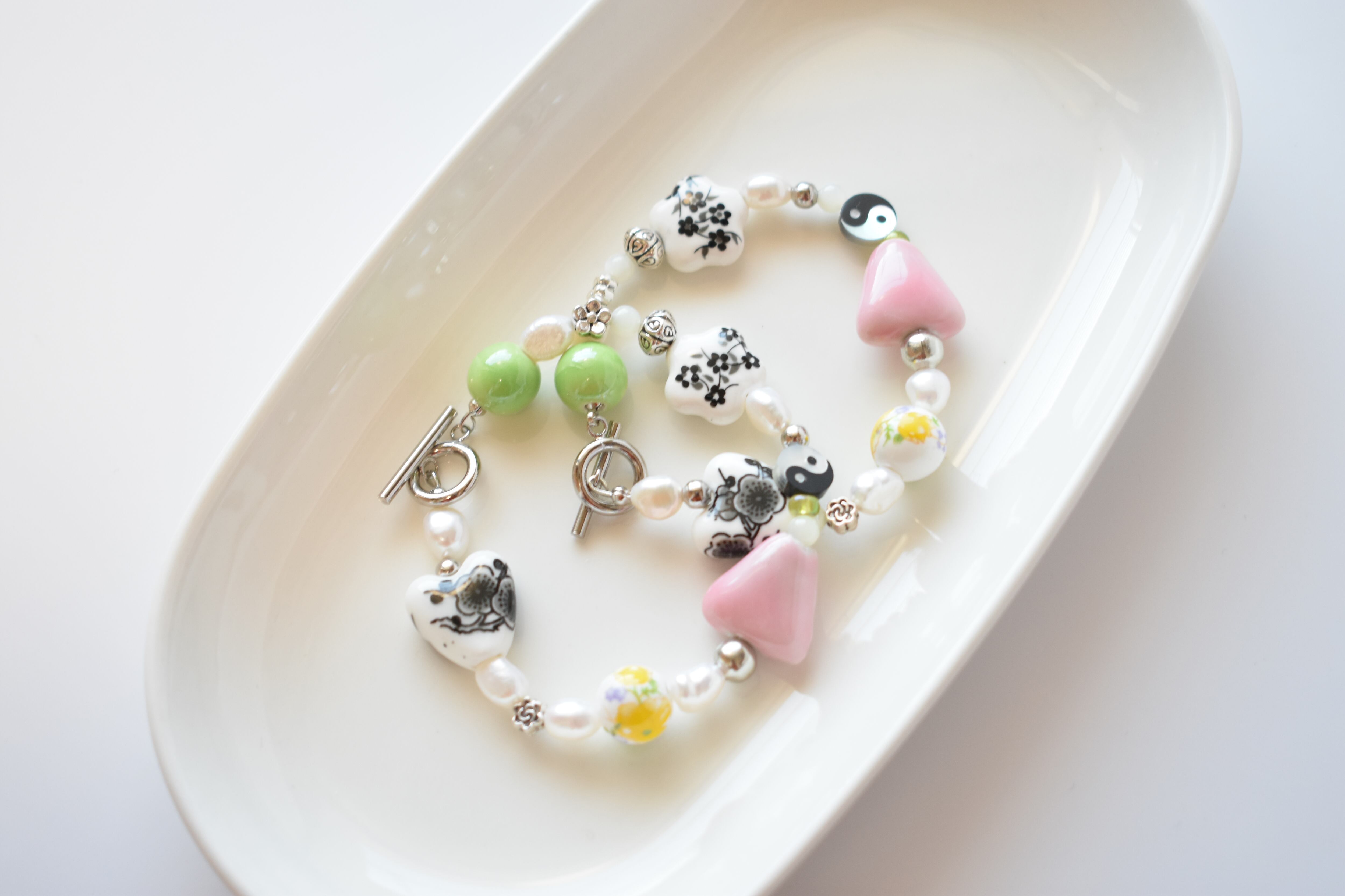 陶器パーツ、シェルビーズ、淡水パール等を使用。